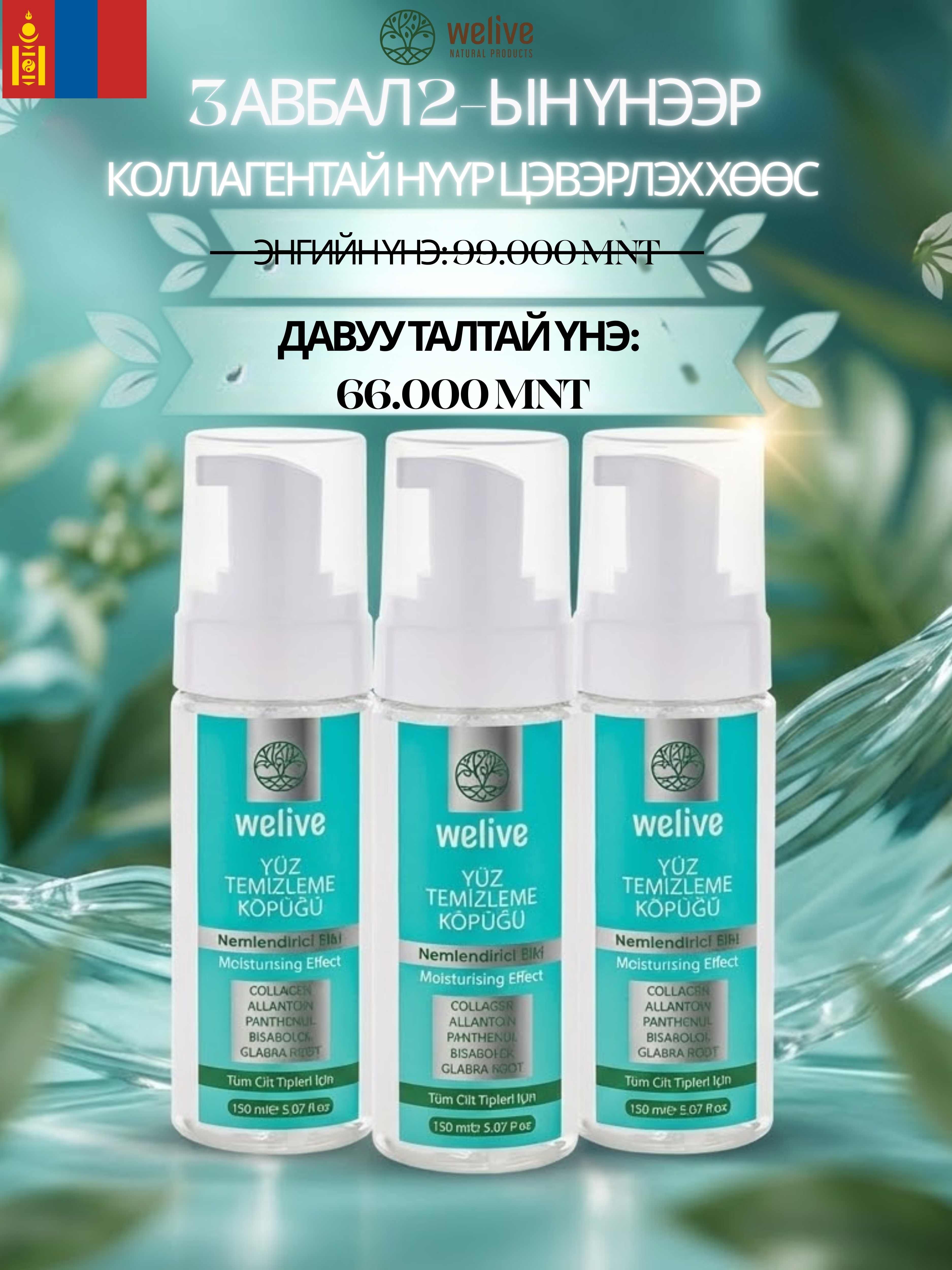 WELIVE KOLAJENLİ YÜZ YIKAMA KÖPÜĞÜ 150 ML 3 AL 2 ÖDE / WELIVE КОЛЛАГЕНТАЙ НҮҮР УГААХ ХӨӨС 150 МЛ – 3 АВБАЛ 2-ЫН ТӨЛӨӨ